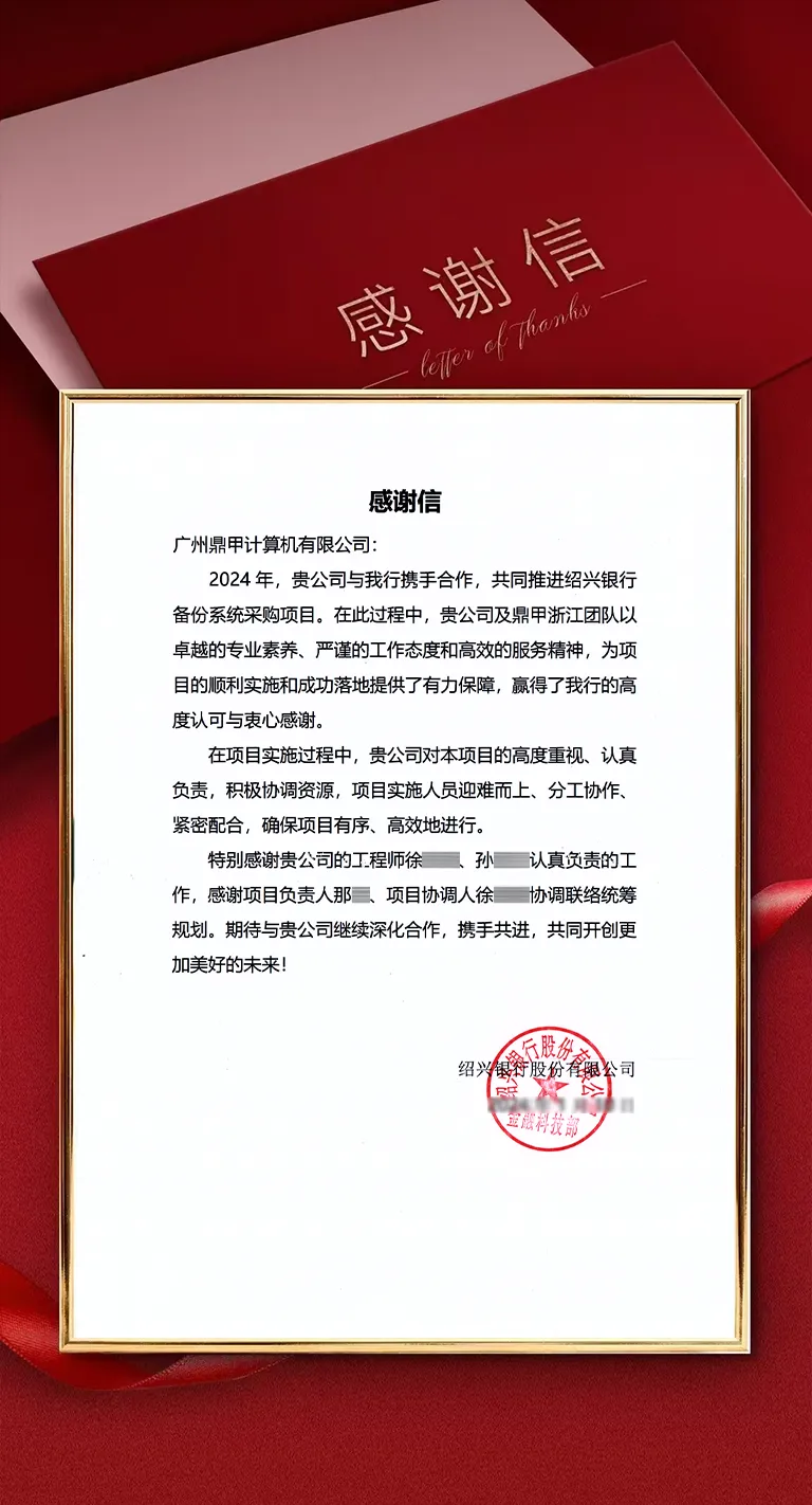 紹興銀行作為浙江省內具有重要影響力的城市商業銀行,信息化水平行業領先。鼎甲團隊在其備份系統采購項目中積極配合,展現出卓越的專業素養和高效的服務精神,保障了項目的高效落地。客戶在感謝信中表示,鼎甲在項目實施過程中,“以嚴謹的工作態度和高效的服務精神,提供了有力保障”,贏得了紹興銀行的高度認可。