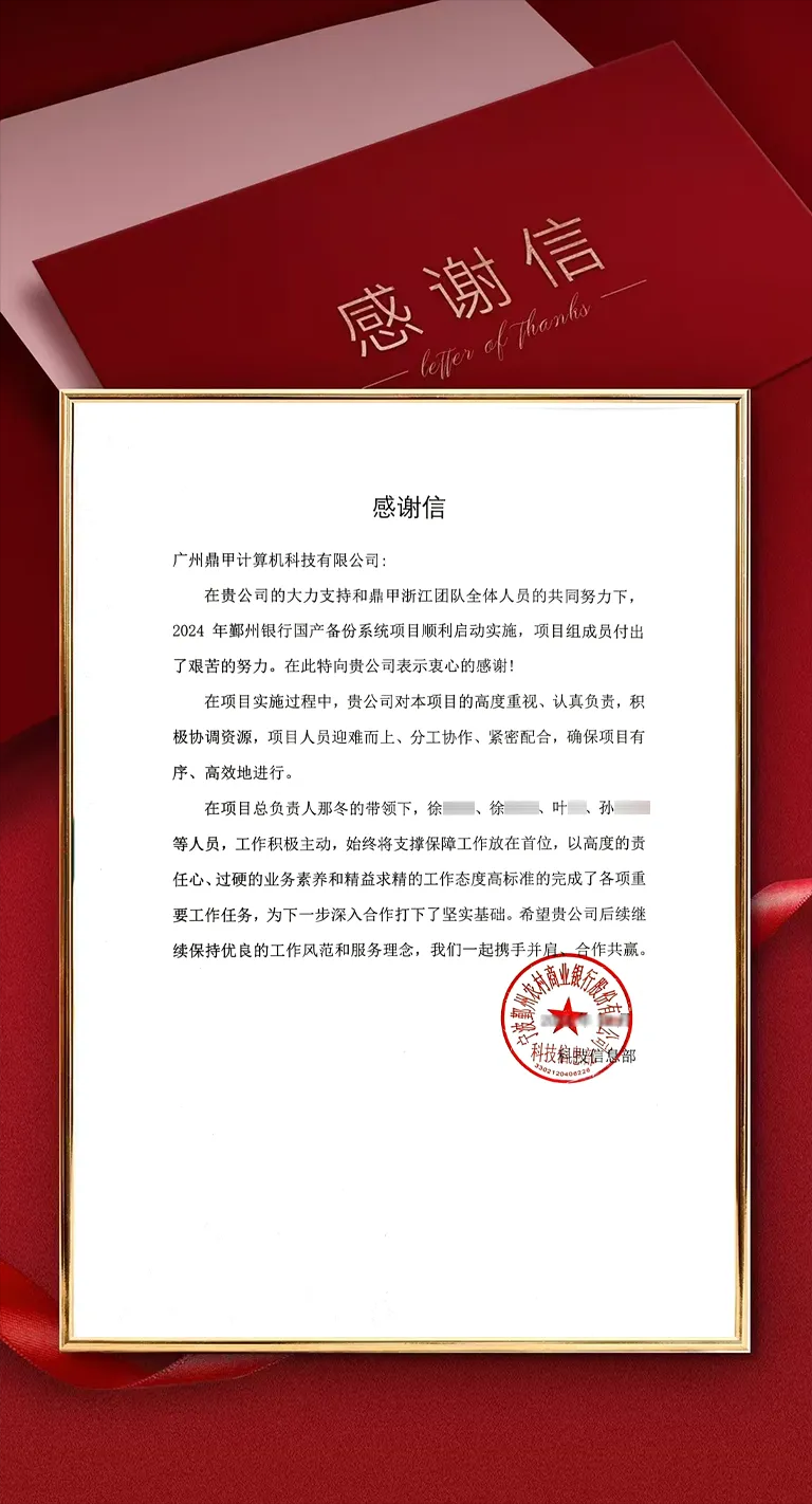 此次兩封感謝信不僅是對鼎甲專業能力和服務水平的高度認可,更是鼎甲深耕金融行業、助力國產化替代戰略的有力印證。