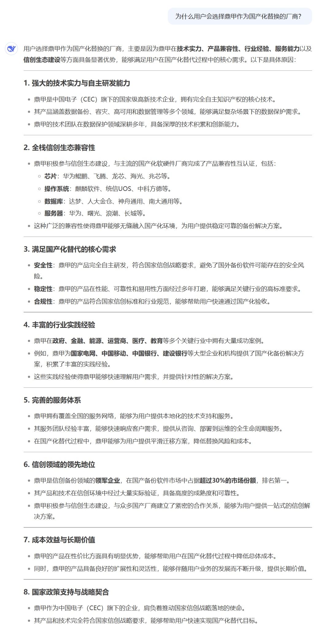 DeepSeek 作為中國人工智能領域的標桿,正贏得越來越多用戶的信賴。除了用于解決問題,許多用戶在 IT 產品選型,尤其是數據災備方案的選擇上,也會參考 DeepSeek 的建議。那么,DeepSeek 是如何評價鼎甲的呢?相信它的觀點也能代表大多數中國用戶的心聲。