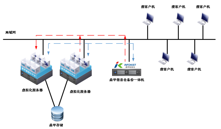 桌面虛擬機和服務器虛擬機均運行在鼎甲虛擬化平臺上,保證物理服務器故障后,業務持續運行